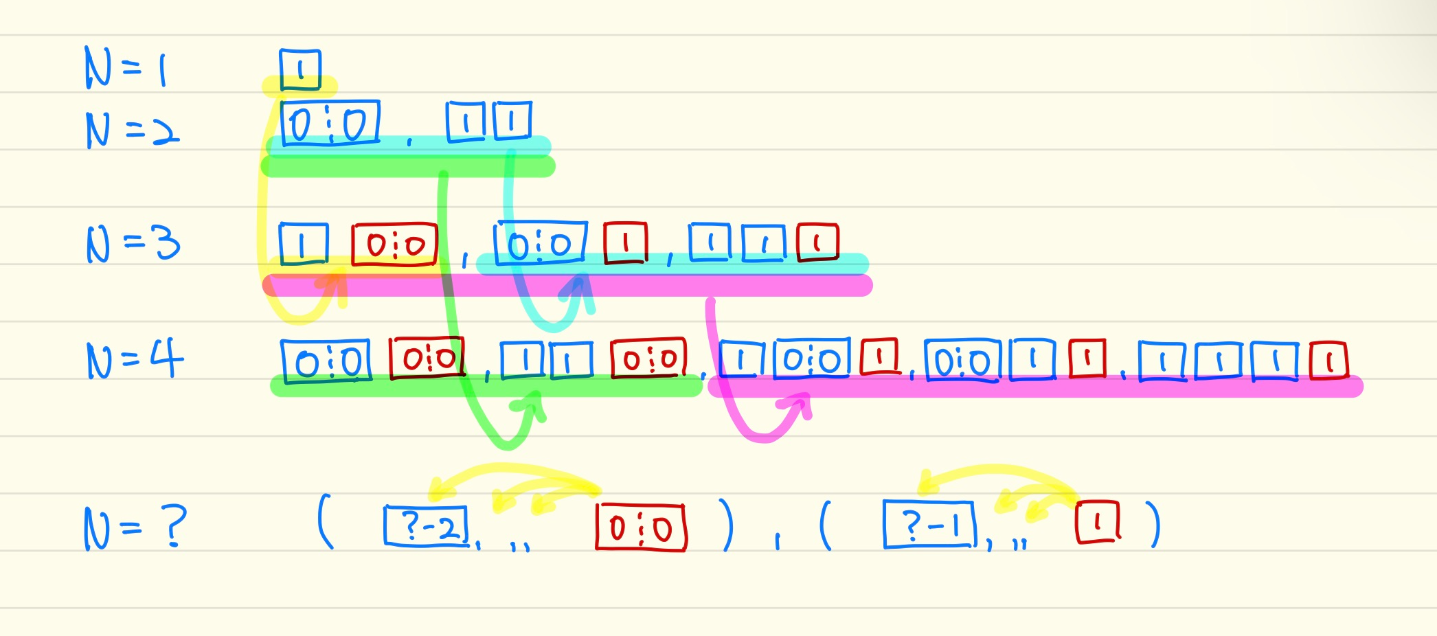 이렇게 두 경우를 나누게 되면 맨 오른쪽의 00 또는 1 을 제외한 왼쪽의 타일들은 이미 이전전번째 (N-2) 와 이전번째 (N-1)에 출현을 했던 경우이다.