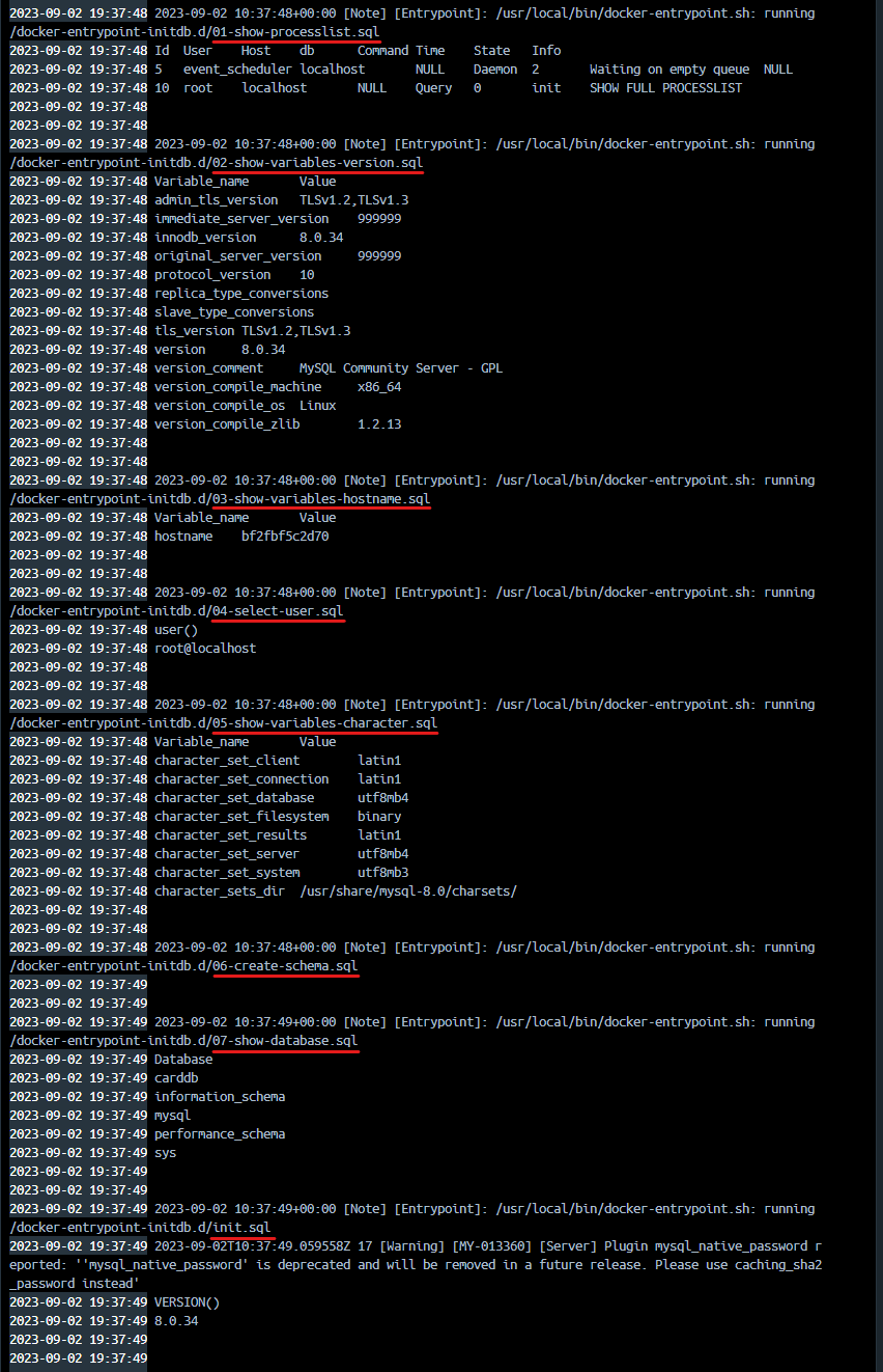 그리고 한 가지 더, 파일로 생성한 SQL 명령문이 Dockerfile 내부에 `RUN echo` 보다 먼저 실행된다는 점이다. COPY를 통해 출력된 sql 파일들 명령보다 RUN echo 명령문으로 지정한 `init.sql`이 더 상위에 있음에도 logs에 표시된 순서에서는 가장 나중이었다.