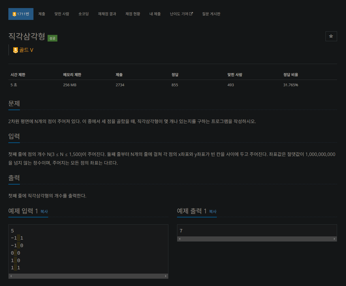 BufferedReader를 이용하여 주어진 모든 좌표를 long 타입으로 입력받고, 브루트포스 알고리즘답게 모든 경우의 수를 생각하여 점 3개씩 꺼내어 만들 수 있는 세 변의 길이를 모두 구하여 피타고라스 정리를 만족하는지 확인한다. 만족할 때마다 누적 카운트 하여 출력한다.
