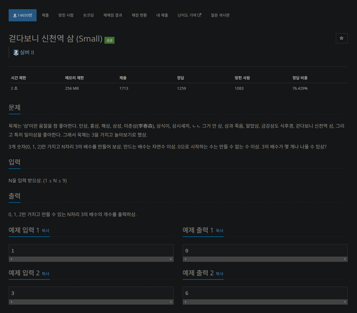 재귀 함수를 돌때마다 N은 1씩 줄어들고 N이 1이 되었을 때 생성된 숫자가 3으로 나누어 지는지 판단하여 카운트를 한다.