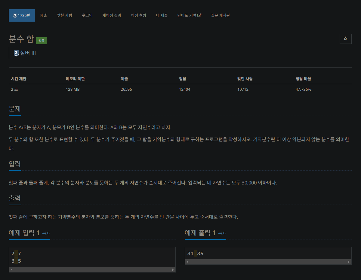 int gcd = findGCD(numerator, denominator); // 분자와 분모의 최대공약수