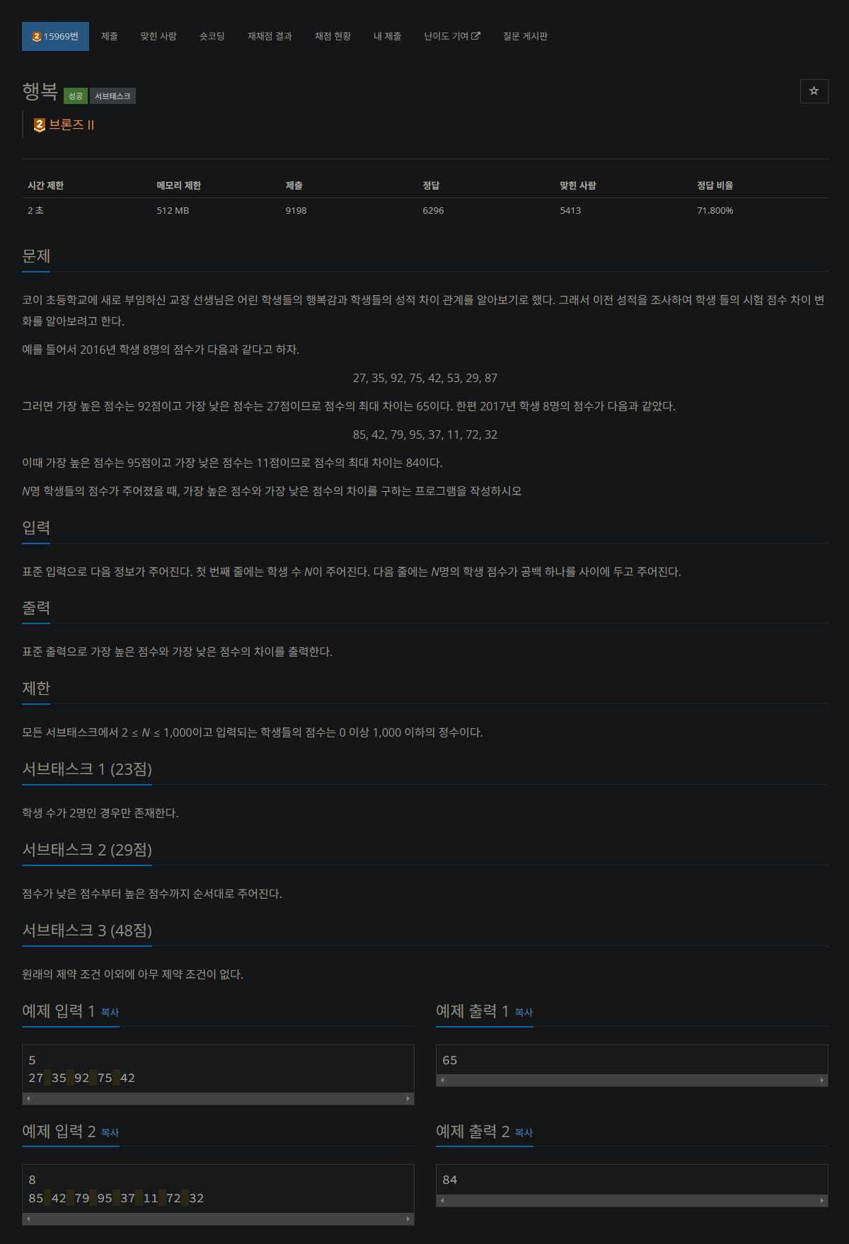 모든 서브태스크에서 2 ≤ N ≤ 1,000이고 입력되는 학생들의 점수는 0 이상 1,000 이하의 정수이다.