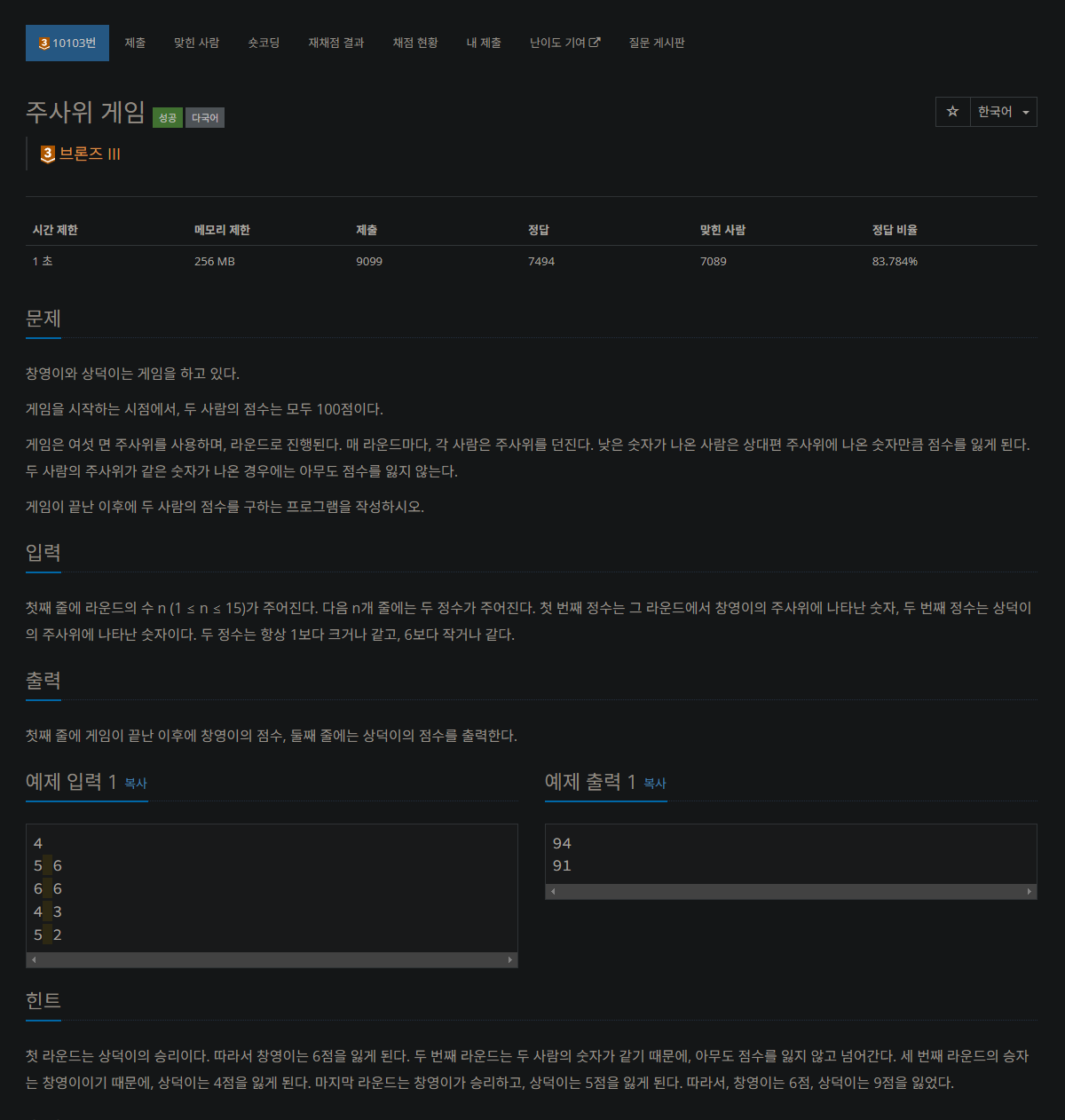 첫 라운드는 상덕이의 승리이다. 따라서 창영이는 6점을 잃게 된다. 두 번째 라운드는 두 사람의 숫자가 같기 때문에, 아무도 점수를 잃지 않고 넘어간다. 세 번째 라운드의 승자는 창영이이기