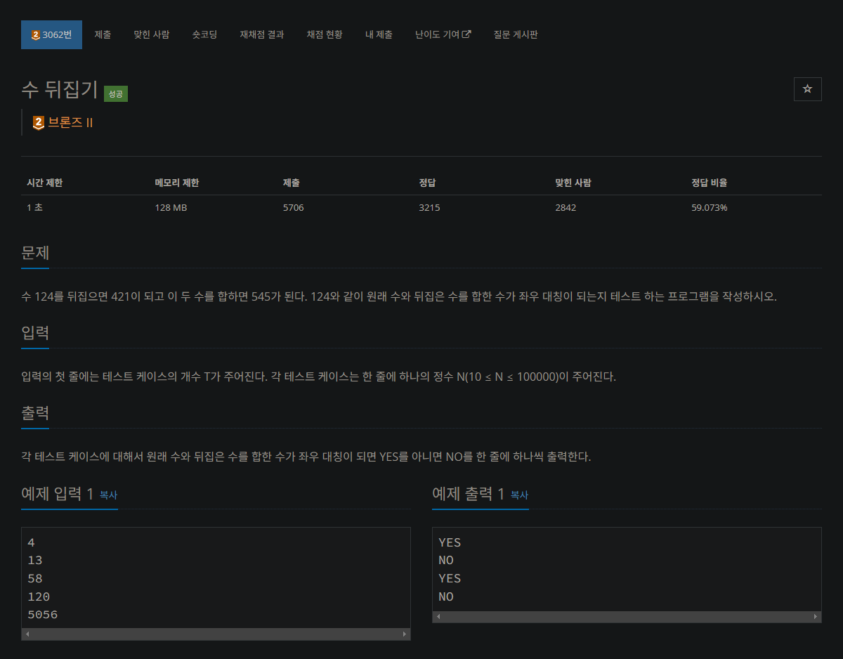 수 124를 뒤집으면 421이 되고 이 두 수를 합하면 545가 된다. 124와 같이 원래 수와 뒤집은 수를 합한 수가 좌우 대칭이 되는지 테스트 하는 프로그램을 작성하시오.