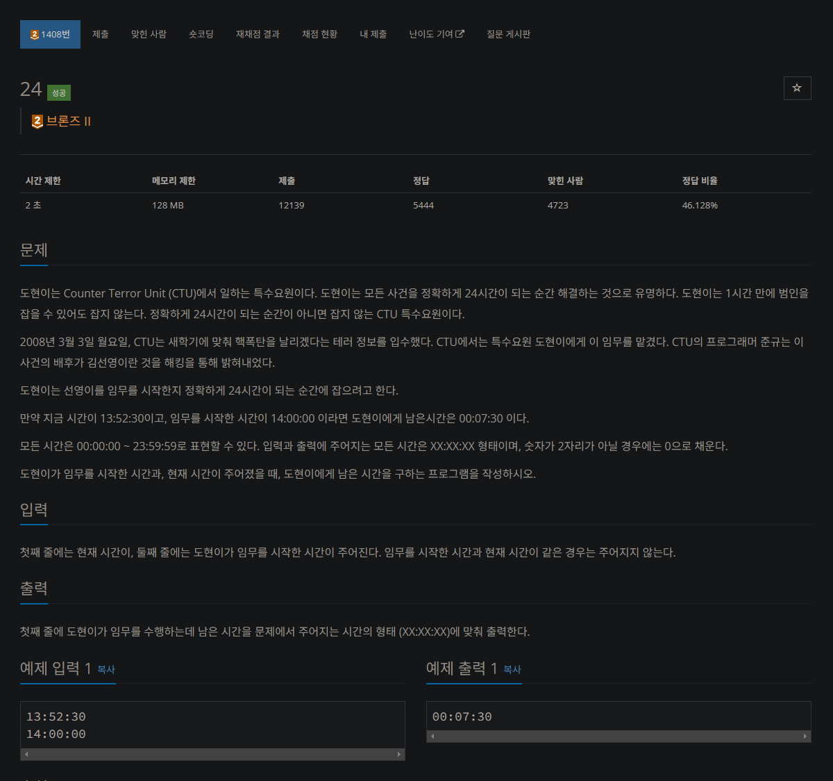 도현이는 Counter Terror Unit (CTU)에서 일하는 특수요원이다. 도현이는 모든 사건을 정확하게 24시간이 되는 순간 해결하는 것으로 유명하다. 도현이는 1시간 만에 범인을 잡을 수 있어도 잡지 않는