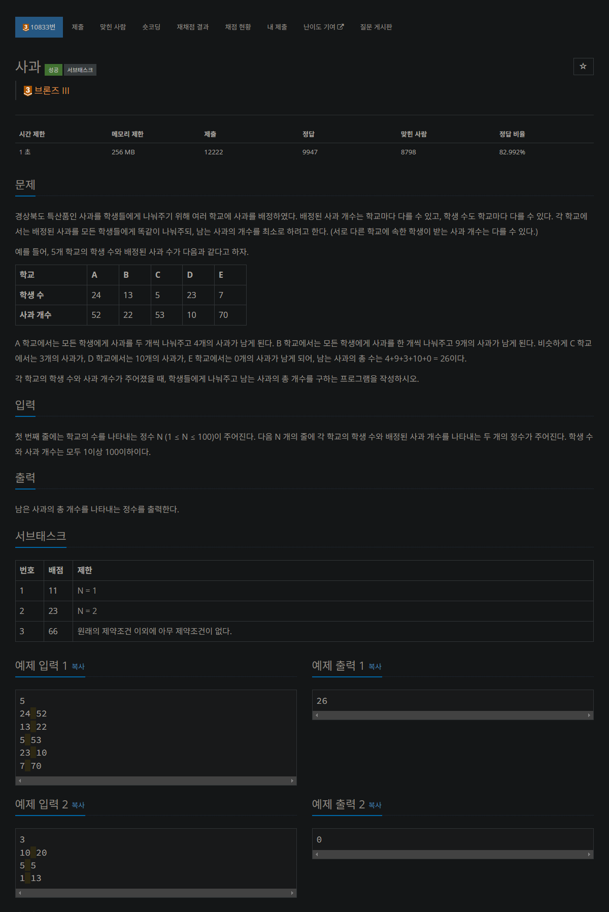 경상북도 특산품인 사과를 학생들에게 나눠주기 위해 여러 학교에 사과를 배정하였다. 배정된 사과 개수는 학교마다 다를 수 있고, 학생 수도 학교마다 다를 수 있다. 각 학교에서는 배정된 사