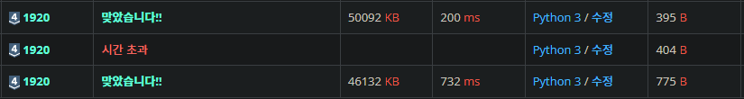 이분 탐색 코드를 제출한 맨 아래 결과와 if in list() 를 사용했을 때 시간초과가 난 중간, 그리고 if in set() 을 사용했을때 나타난 결과가 제일 위이다. 답안 제출 시 시간에서 많은 차이를 보인다.