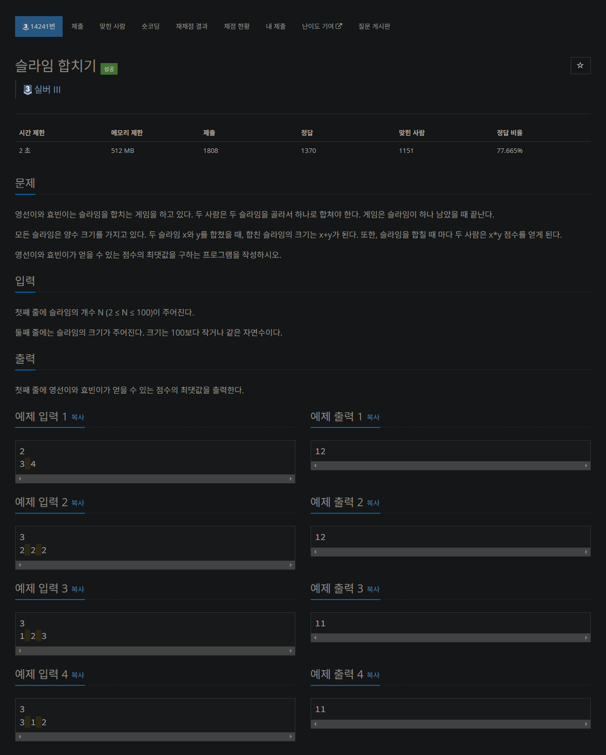 영선이와 효빈이는 슬라임을 합치는 게임을 하고 있다. 두 사람은 두 슬라임을 골라서 하나로 합쳐야 한다. 게임은 슬라임이 하나 남았을 때 끝난다. 모든 슬라임은 양수 크기를 가지고 있다. 두