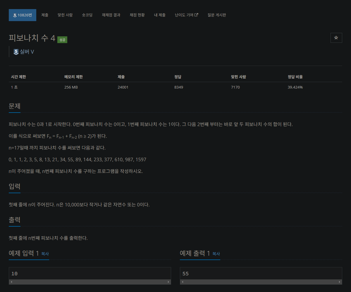 피보나치 수는 0과 1로 시작한다. 0번째 피보나치 수는 0이고, 1번째 피보나치 수는 1이다. 그 다음 2번째 부터는 바로 앞 두 피보나치 수의 합이 된다. 이를 식으로 써보면 Fn = Fn-1 + Fn-2 (n ≥ 2)가