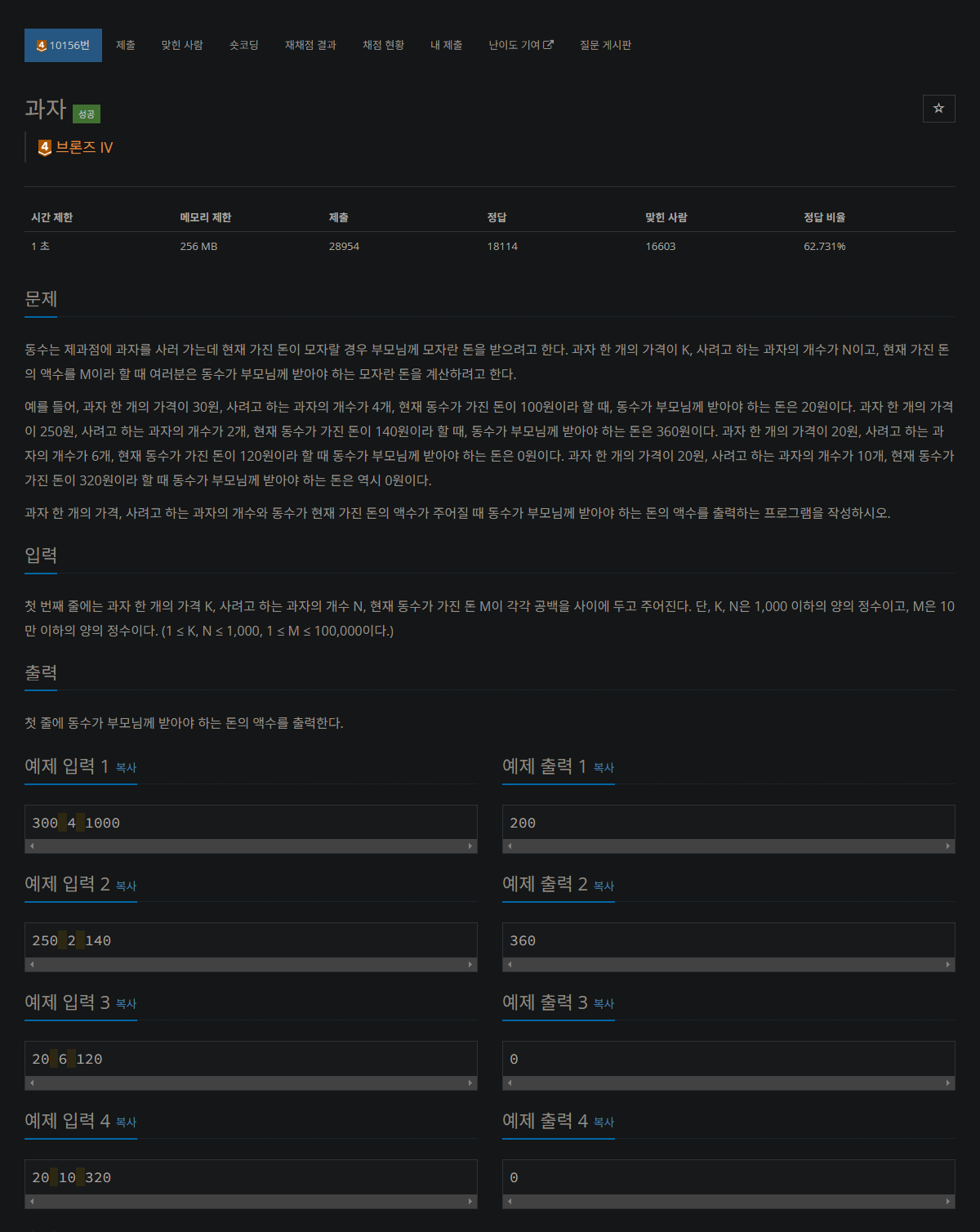 int requiredMoney = calculateRequiredMoney(K, N, M);