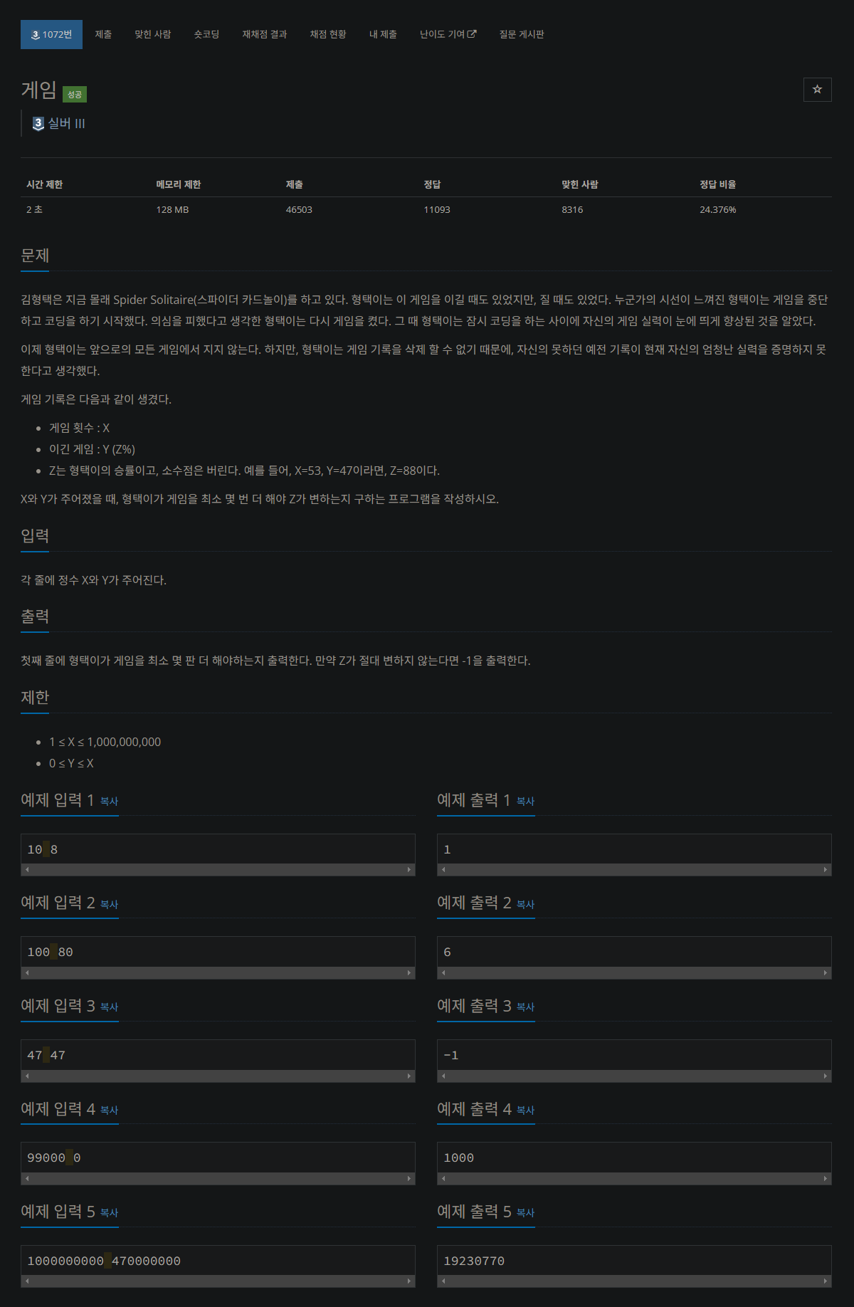 long total = X + mid; // 전체 게임 수에 추가 게임 횟수 더함