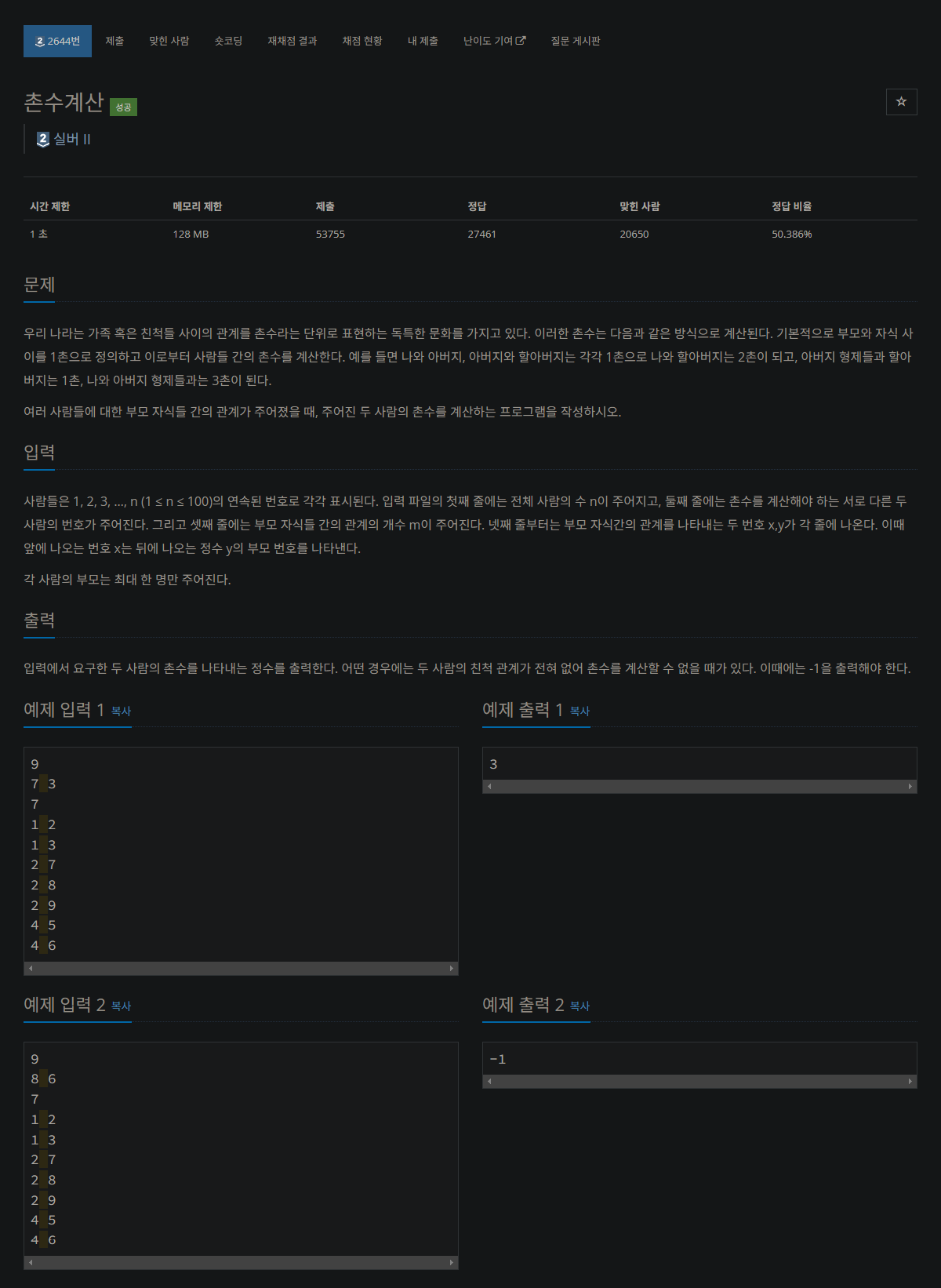 // DFS를 이용하여 두 사람 간의 촌수를 계산
