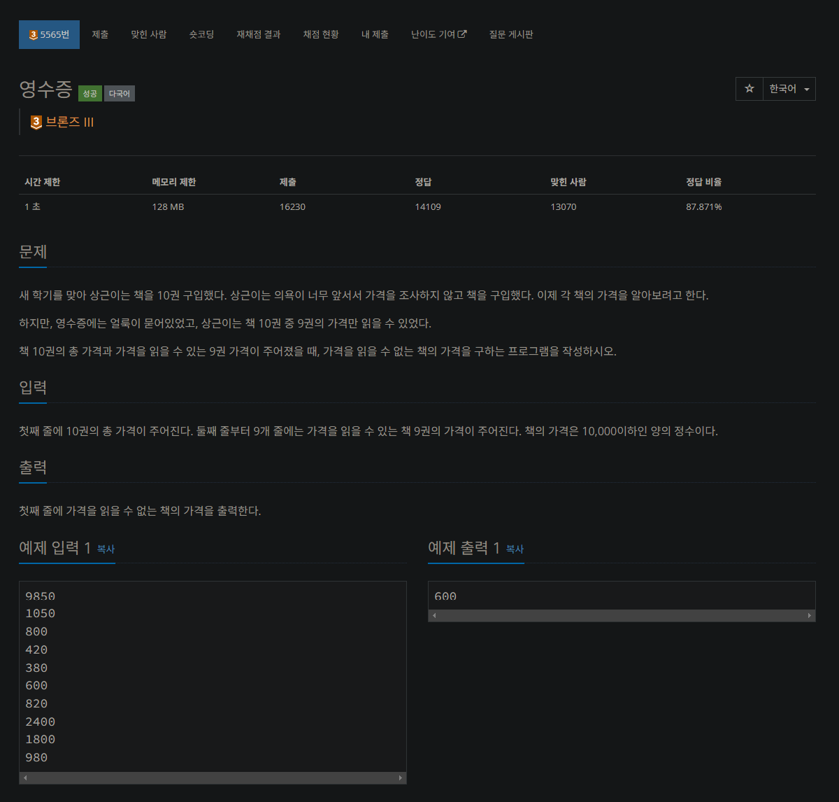 * 책 10권의 총 가격과 9권의 가격 배열을 받아