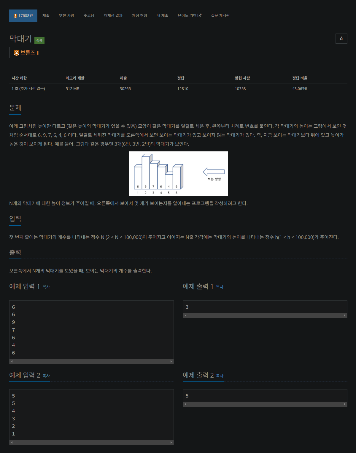 // 스택이 비어 있거나 현재 막대기가 스택의 top보다 높으면 보이는 막대기