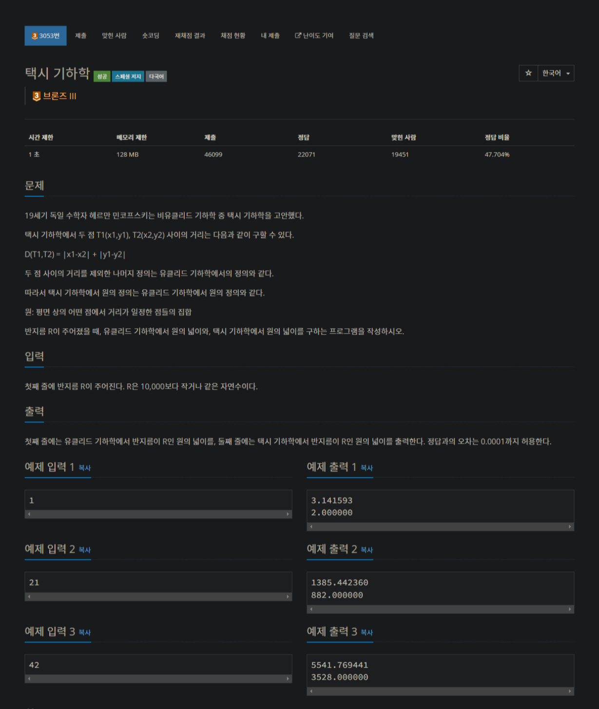 당연하겠지만 택시 기하학이 무엇인지 이해하는 게 이 문제의 포인트인 것 같다. 수학적 무언가를 요구한다기 보다는..